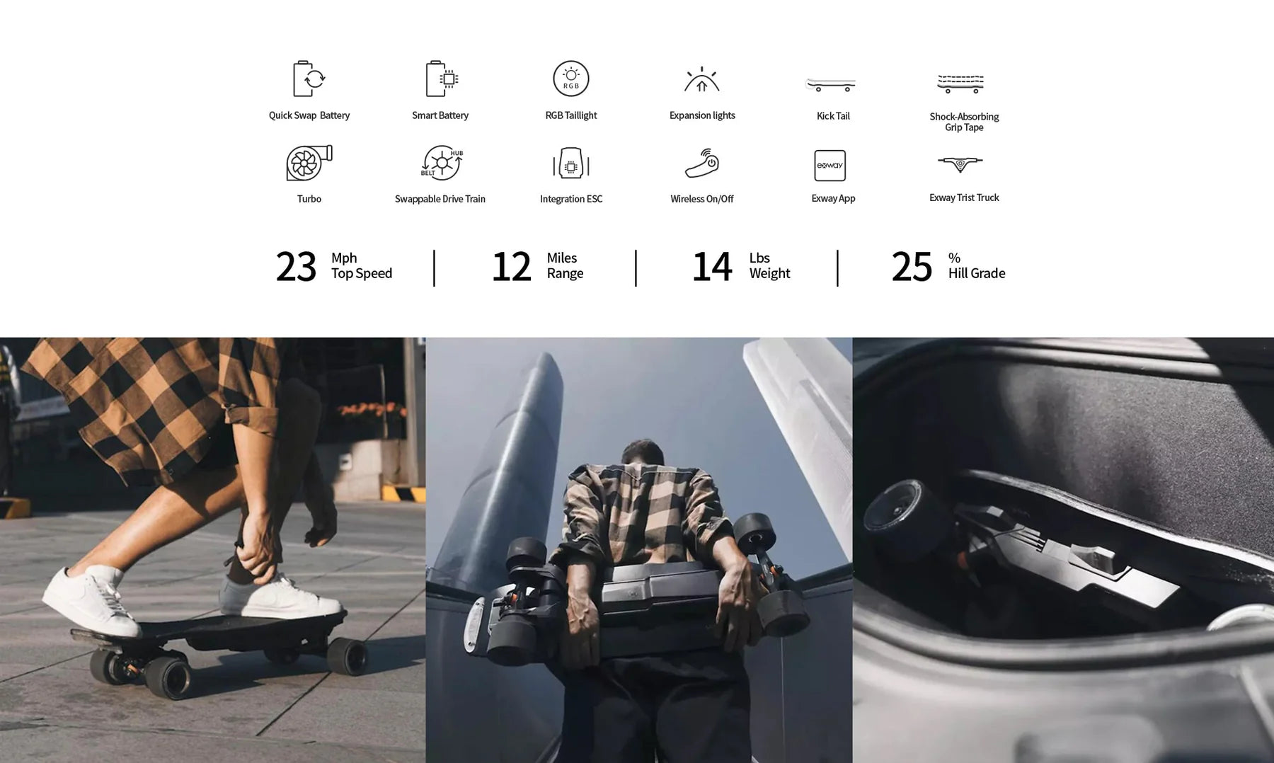 • Exway Wave is not only smaller in size and weight, but also meets the performance needed for daily use. You can put it under your seat, throw it in your suitcase, the possibilities are endless.