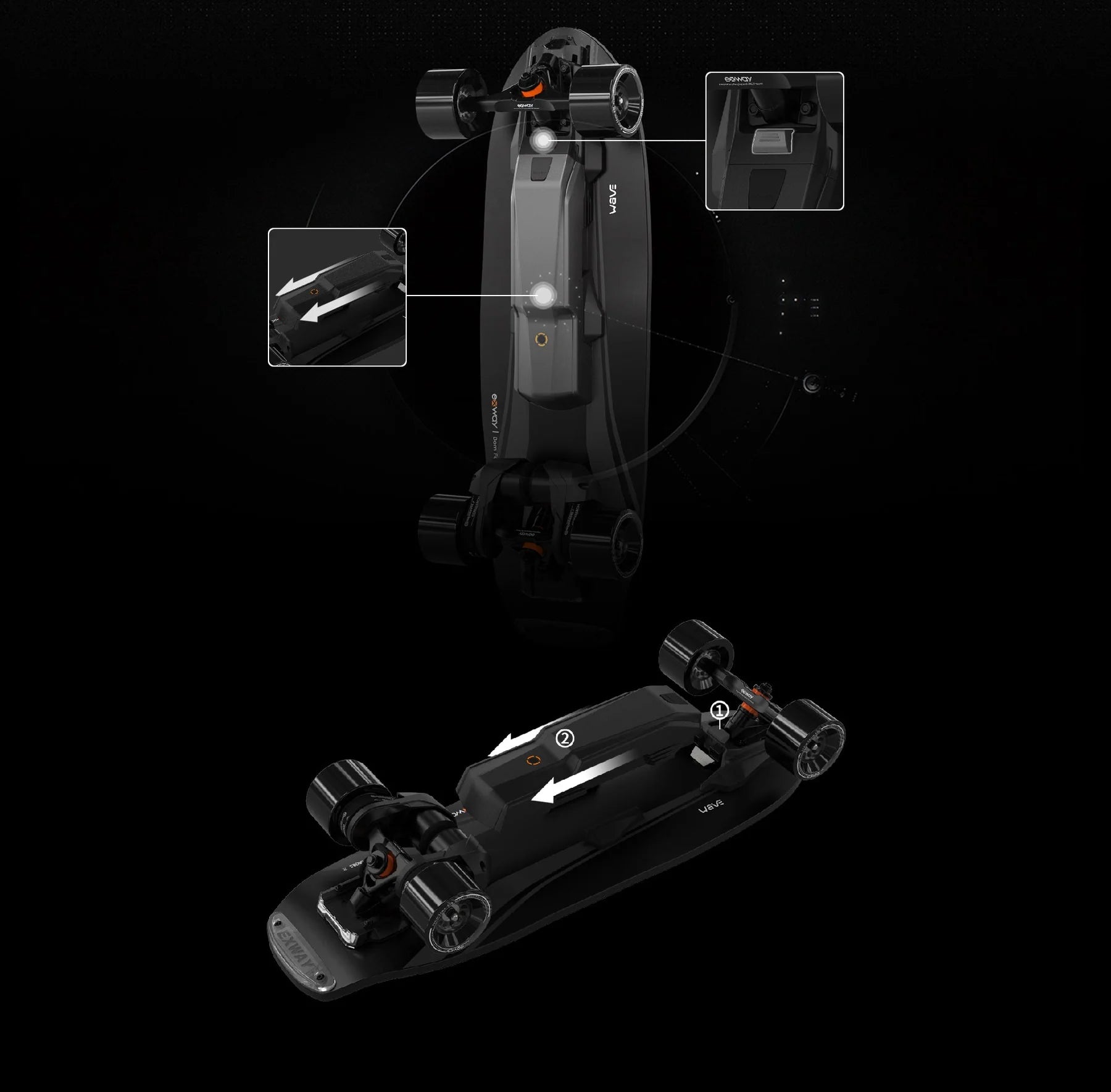 To maximize the space available for the battery module, we've built the ESC into the base of the drivetrain. And we didn't stop there.Front and rear lights powered by the battery module have also been integrated into the base of the trucks,controlled by one touch button on the remote.No more bending down to turn your lights on, no more forgetting to charge your lights, just grab your Wave and go ride!