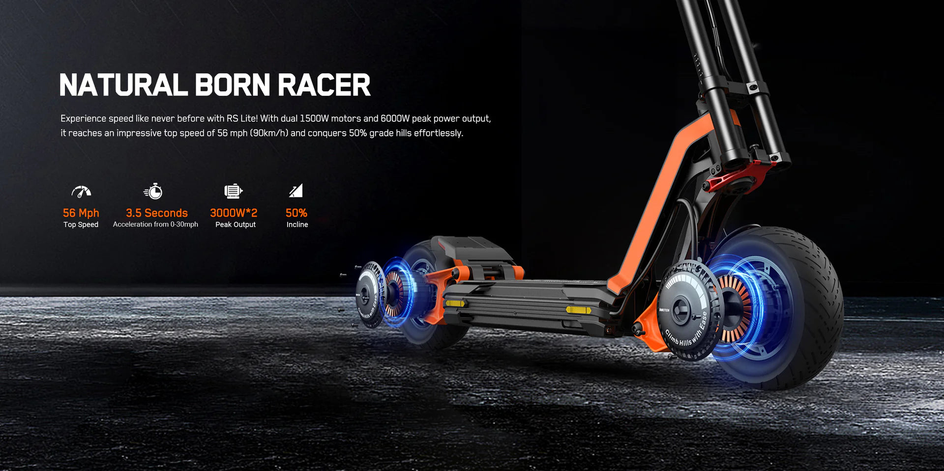 Motor Power 1500W*2 Top Speed 56MPH Acceleration from 0-30mph 3.5 SECONDS Hills Climbing 50°