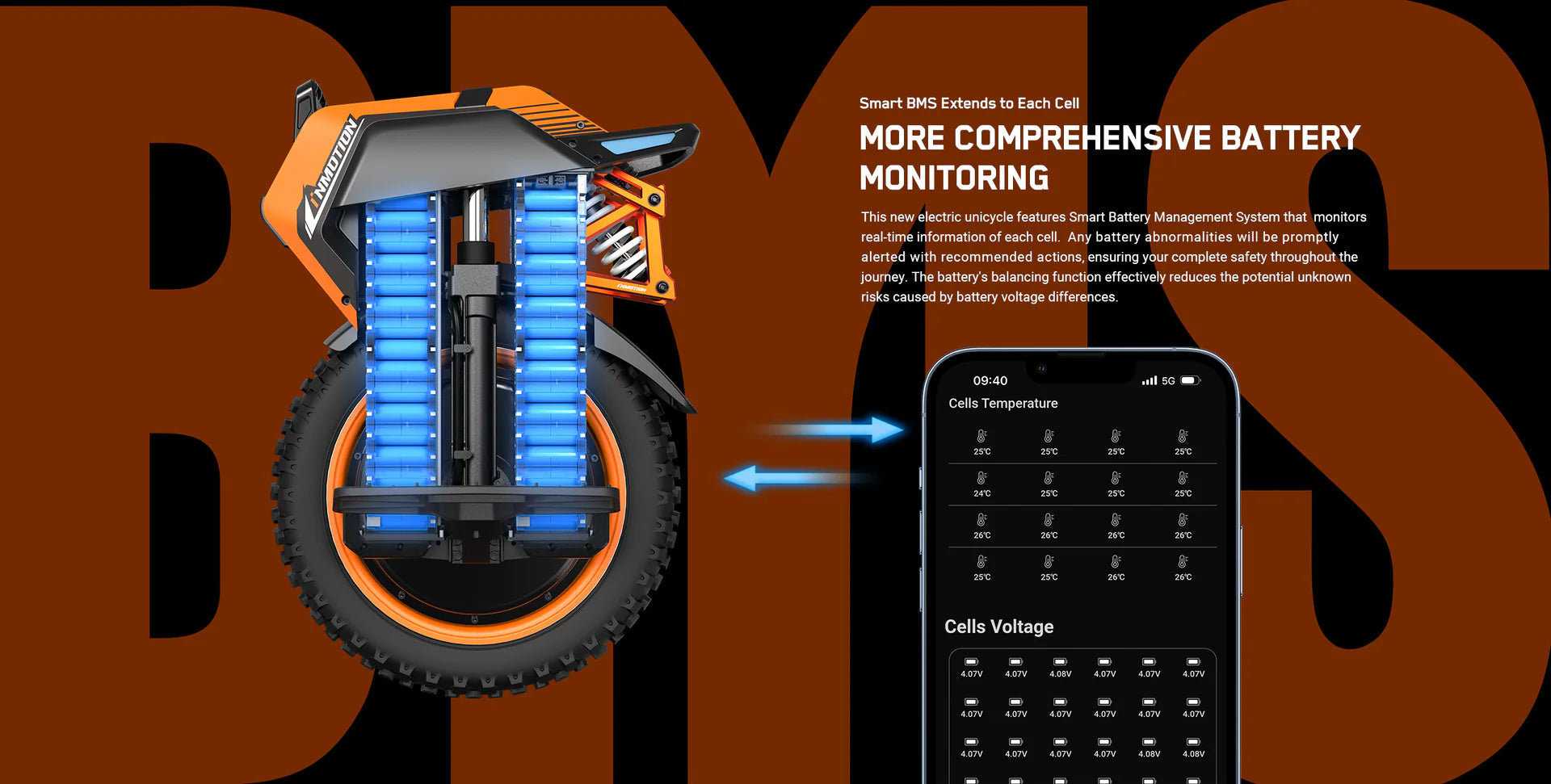 - Powerful Motor: Equipped with a C40 magnetic steel motor, the V14 boasts a peak power of 9000W and a maximum power limit of 12000W. It effortlessly conquers 50° inclines with an astonishing 850N of wheel tractive force.
