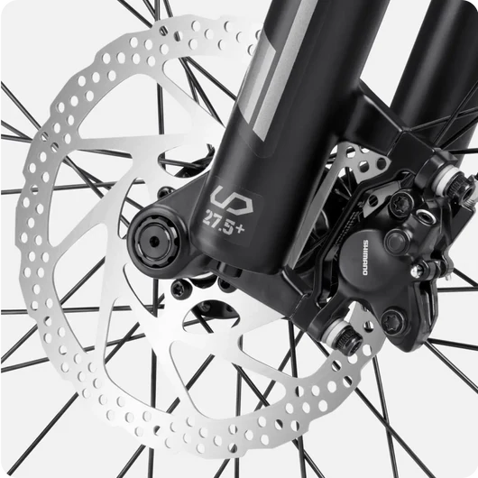 The hydraulic suspension with 120mm travel and lockout, absorbs impacts and vibrations on rough terrain, enhancing comfort, traction, and control for a smoother and safer ride.